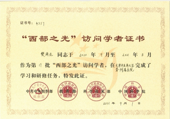 樊海龙博士获颁“西部之光”访问学者证书。樊海龙博士表示:下一步将依托“石学敏国医大师传承工作室”,在院领导的支持下,落实好呼和浩特市人民政府“六大产业集群”建设项目之一“石学敏国医大师传承工作室建设项目”,把骰宝玩法中心